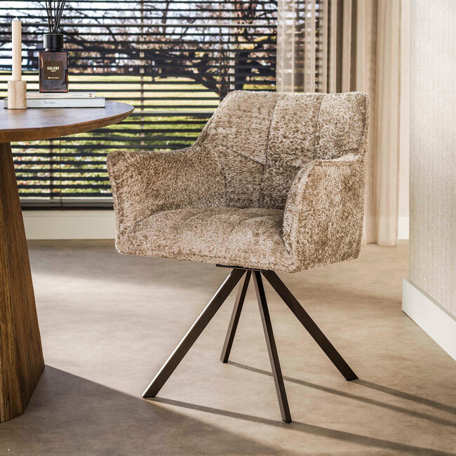 De Armstoel Raster draaibaar Hoven zand is een stijlvolle eetkamerstoel met een zachte, natuurlijke uitstraling. De zandkleurige stof geeft je interieur rust en warmte, terwijl het bruine metalen frame zorgt voor een stoer en modern contrast.