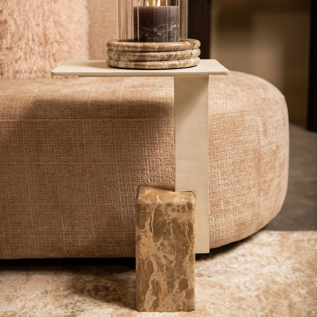 De Bijzettafel Ebe van PTMD is een verfijnde en luxe toevoeging aan ieder interieur. Deze bijzondere bijzettafel combineert een massieve beige marmeren voet met een rechthoekig blad van gegoten aluminium, wat zorgt voor een krachtig contrast tussen natuurlijke en industriële materialen. Dankzij het slanke ontwerp is de tafel perfect als bijzettafel naast de bank, fauteuil of als decoratief accent in een leeshoek.