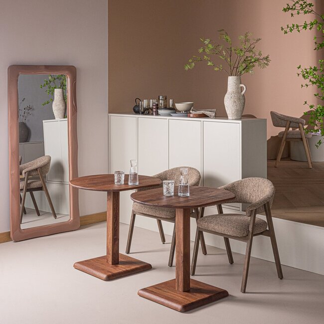 De Feno bistrotafel eindstuk is gemaakt van mangohout, een materiaal dat bekend staat om zijn sterkte en natuurlijke uitstraling. Het mangohout heeft een warme, diepe donkerbruine kleur die karakter toevoegt aan jouw ruimte. De zichtbare nerf- en houttekening maken elk meubel uniek en zorgen voor een authentieke, natuurlijke look die het interieur een persoonlijke touch geeft.