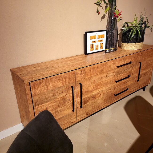 Met zijn 3 deuren en 3 ruime softclose lades biedt het Westport dressoir volop opbergruimte voor servies, documenten of woonaccessoires. De strakke zwarte metalen grepen en poten geven het geheel een industriële touch, die prachtig combineert met de warme houttint.
