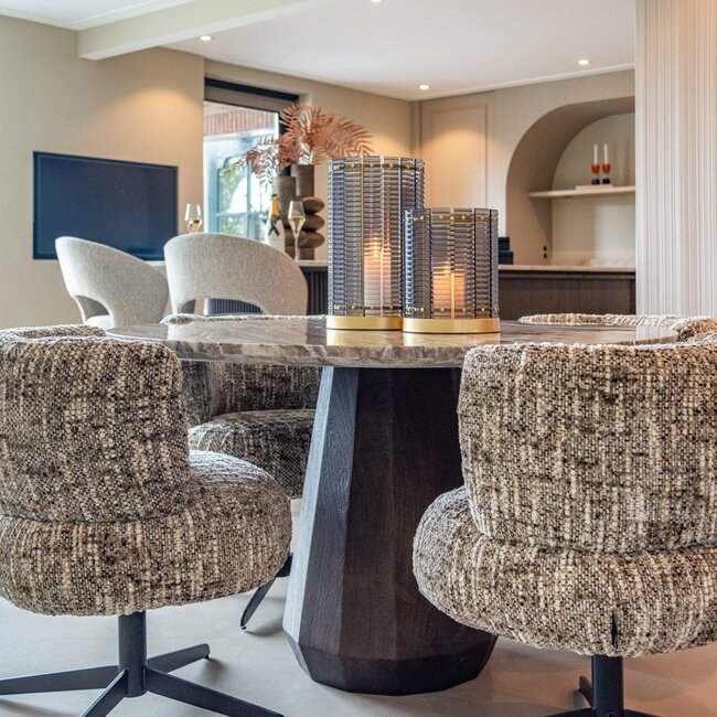 Combineer de Eettafel Oberoy Blush beige 130Ø met accessoires in warme tinten, zachte stoffen en luxe materialen zoals messing, fluweel of marmer. Voeg een bijzettafel of vloerkleed toe voor een compleet geheel.