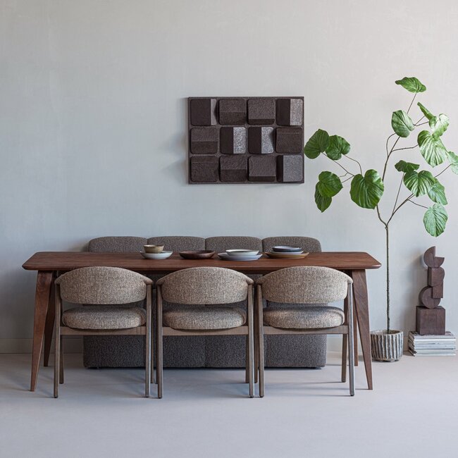 De Rubo eettafel is gemaakt van mangohout, een materiaal dat bekend staat om zijn sterkte en natuurlijke uitstraling. Het mangohout heeft een warme, donkerbruine kleur die karakter toevoegt aan jouw ruimte. De zichtbare nerf- en houttekening maken elk meubel uniek en zorgen voor een authentieke, natuurlijke look die het interieur een persoonlijke touch geeft.
