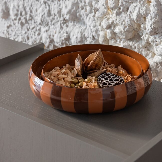 De Elda schalen van het Nederlandse interieurmerk WOOOD zijn een vrolijke, sfeervolle toevoeging in elk interieur! Het trendy streeppatroon en de warme kleurencombinatie maken deze set tot echte blikvangers op een tafel, dressoir of kast. De set van 2 geeft u de vrijheid om de items samen of apart te stylen. De Elda set is praktisch, vrolijk en helemaal van nu!