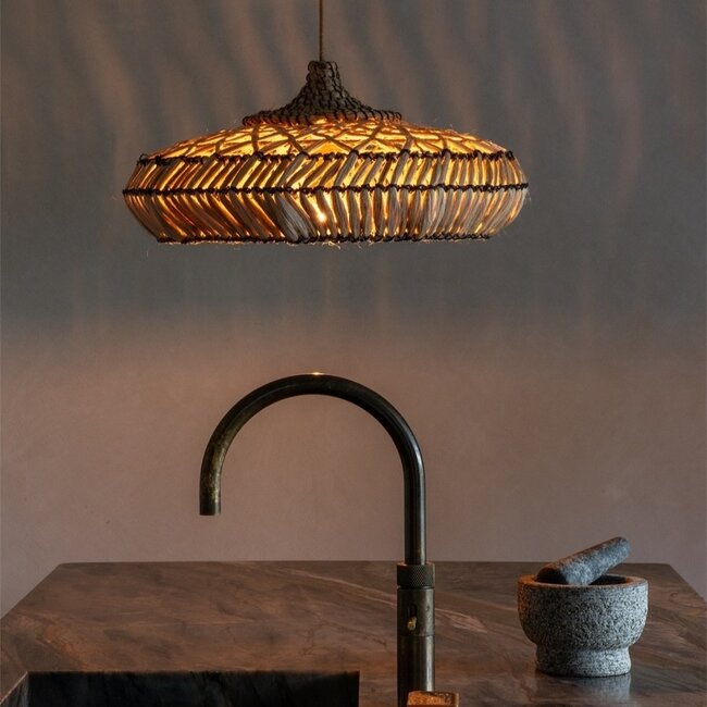De RINJANI hanglamp is perfect boven een grote eettafel, in een ruime zithoek of als statement piece in een hoge hal. Dankzij het natuurlijke kleurgebruik met subtiele zwarte accenten past deze lamp moeiteloos in interieurs met een boho, Japandi, landelijke of modern natuurlijke woonstijl.