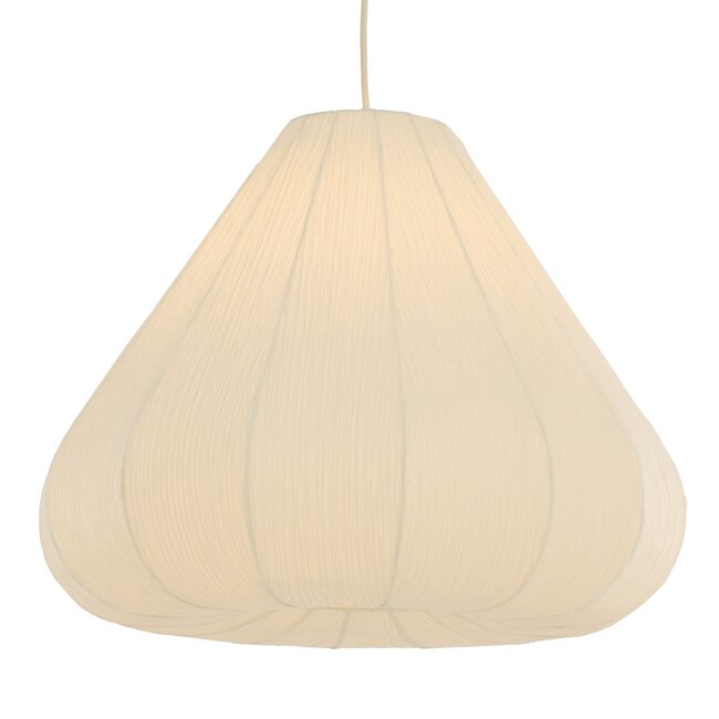 De lamp is vervaardigd uit wit papier, wat zorgt voor een zachte lichtverspreiding. Het licht wordt gelijkmatig gefilterd en creëert een warme, uitnodigende sfeer. Perfect boven de eettafel, in de woonkamer of in een ruime hal.