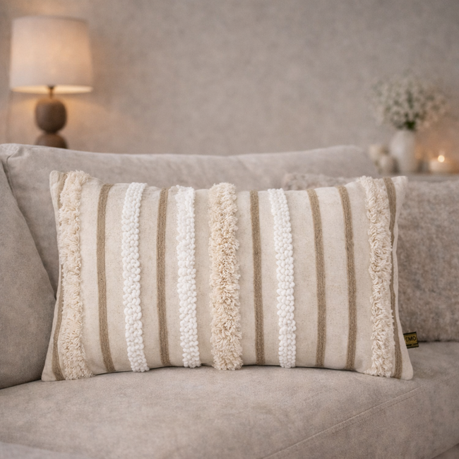 Kussen Rashel is verkrijgbaar in zowel een rechthoekige als vierkante uitvoering, waardoor je eenvoudig kunt combineren en variëren op de bank, fauteuil of het bed. De neutrale tint maakt dit kussen ideaal om te mixen met warme aardetinten, hout en andere natuurlijke materialen.