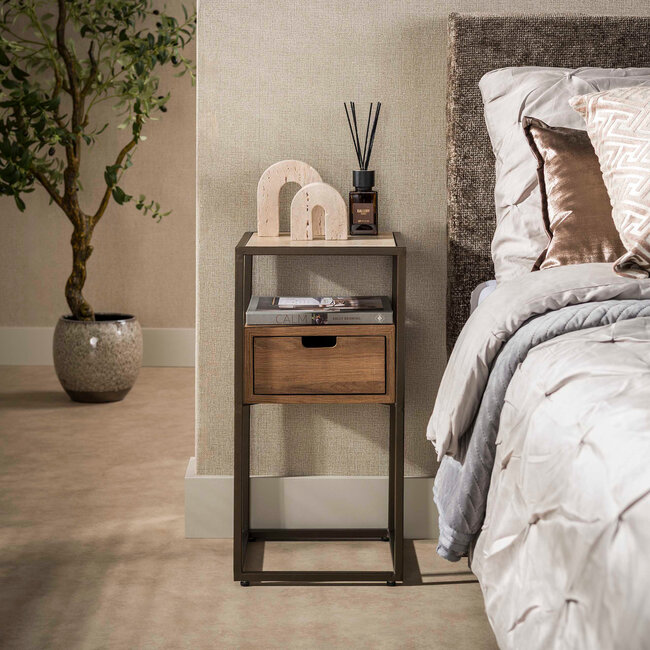 Het stevige metalen frame in bronskleur geeft het nachtkastje een moderne en elegante uitstraling. De combinatie van metaal, houtlook en keramiek zorgt voor een tijdloos ontwerp dat past binnen moderne, industriële en hotel chique interieurs.