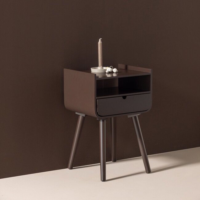 De Nils bijzettafel van het Nederlandse interieurmerk WOOOD combineert een speels ontwerp met praktische opbergruimte. De sfeervolle, donkerbruine kleur en het luchtige ontwerp passen perfect in elke ruimte in huis. Nils komt zowel als nachtkastje naast het bed als bijzettafel naast je favoriete fauteuil goed tot zijn recht. Dankzij de lade en het open vak is er ruimte om items stijlvol te presenteren of netjes op te bergen. Nils is altijd de leukste thuis!