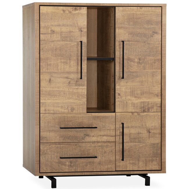 Voorzien van 3 deuren, 2 softclose lades en 2 open vakken, is deze kast ideaal voor het opbergen én presenteren van jouw favoriete items. Denk aan boeken, servies, woonaccessoires of documenten. De zwarte metalen accenten en het strakke onderstel geven de kast een industriële touch die perfect past bij moderne en landelijke interieurs.