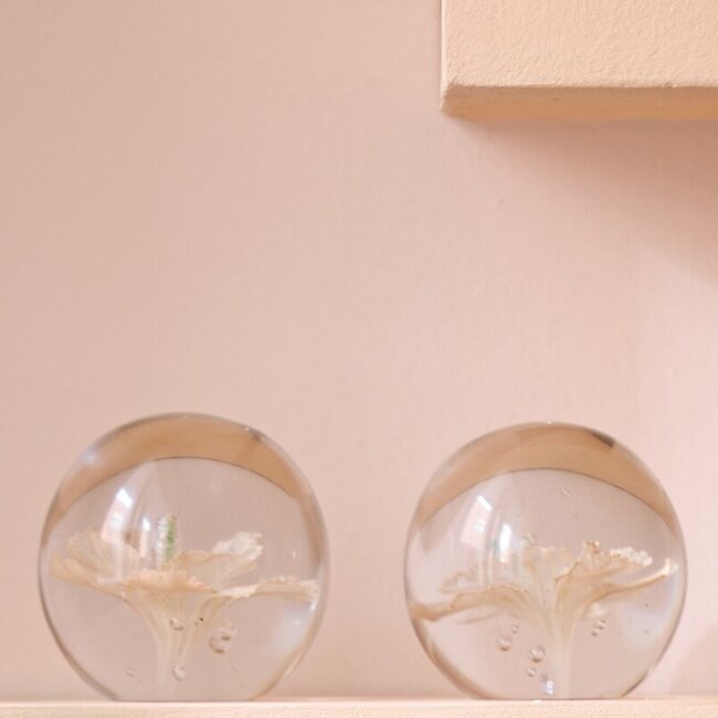 Het ornament is vervaardigd uit hoogwaardig glas en heeft een gladde, luxe afwerking. De bloem lijkt te zweven in het glas, wat zorgt voor een bijzondere diepte en een speels lichteffect wanneer het licht erop valt.