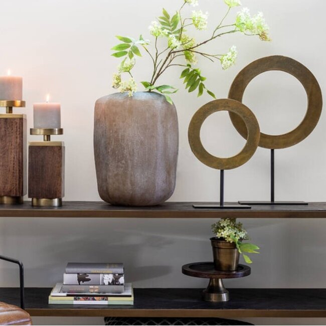Het ornament is gemaakt van metaal en de cirkel heeft een mooie bronzen kleur. De voet is mat zwart van kleur. Dit geeft het ornament een chique uitstraling. Om je interieur compleet te maken zijn er van de serie Waiwo ook nog andere ornamenten en klokken te bestellen. Leuk om dit samen te combineren om je interieur helemaal compleet te maken. Combineer dit ornament met de grote variant voor een mooi geheel.