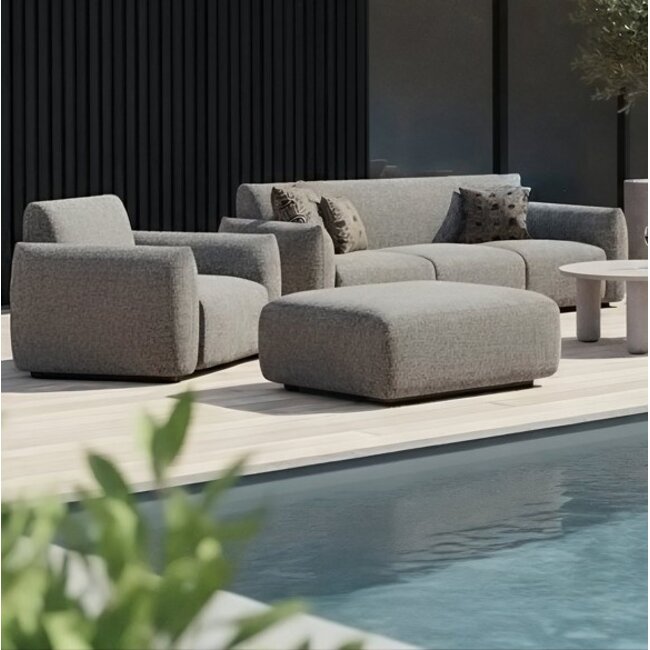 De Dawson loungestoel combineert een diepe zit met waterdoorlatende kussens en een roestbestendig aluminium frame. Ontworpen voor comfort en duurzaamheid buitenshuis. Ook verkrijgbaar in beige.