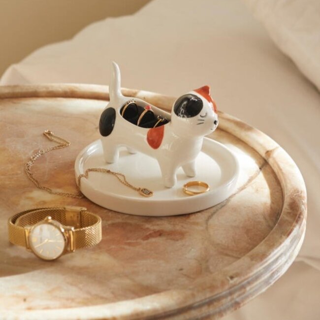 Kitty Calico Katvormige sieradenhouder Keramiek. DECORATIEF EN PRAKTISCH. Een stijlvolle toevoeging aan je nachtkastje, plank of badkamer. Perfect om je sieraden in te leggen als je thuiskomt of om uit te zoeken wat je de volgende dag wilt dragen. HANDGEMAAKT. Gemaakt van hoogwaardig keramiek en met zorg met de hand beschilderd, is elk stuk uniek. ORIGINEEL ONTWERP. De katvorm geeft een speelse touch. Plaats je ringen op de staart of het lijfje, dat is voorzien van een zachte fluwelen tussenschot om ze netjes georganiseerd te houden.