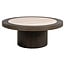 Salontafel Nando heeft een keramisch travertin blad en een basis van eikenfineer. Met zijn natuurlijke tinten en sculpturale vorm vult hij de Ritz-collectie perfect aan.