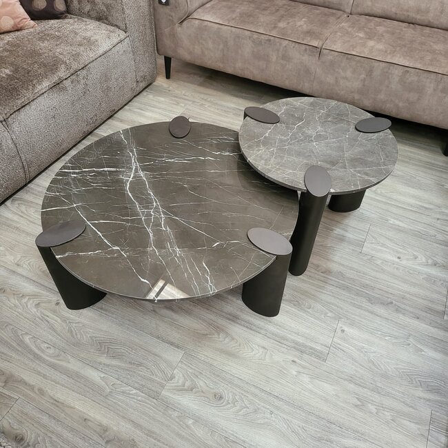 Deze salontafel is handgemaakt, waardoor elk exemplaar uniek is in kleur en marmerstructuur. Met een compact formaat van 60 x 60 cm en een hogere stand van 45,5 cm is deze tafel perfect als bijzettafel naast de bank of als speels hoogteaccent in combinatie met de lagere Ora salontafel.