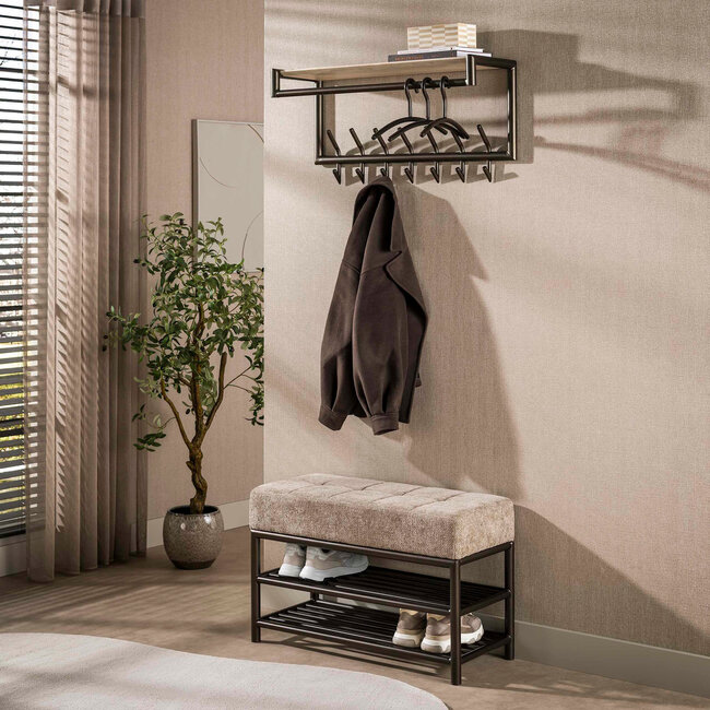Onder de zitting bevindt zich een praktisch schoenenrek, waar meerdere paren schoenen netjes kunnen worden opgeborgen. Hierdoor blijft de hal overzichtelijk en opgeruimd.