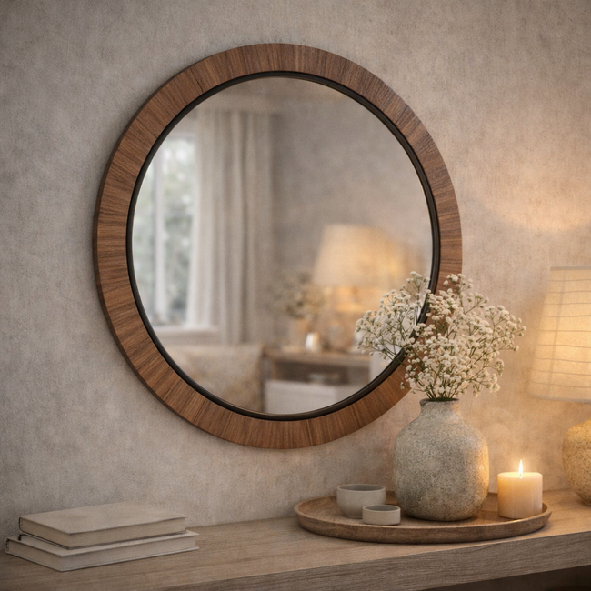 Het frame is vervaardigd uit MDF hout met een natuurlijke houtlook en subtiele metalen afwerking. Deze combinatie geeft de spiegel een warme, verfijnde uitstraling die perfect past binnen moderne, Scandinavische, Japandi en landelijke woonstijlen.