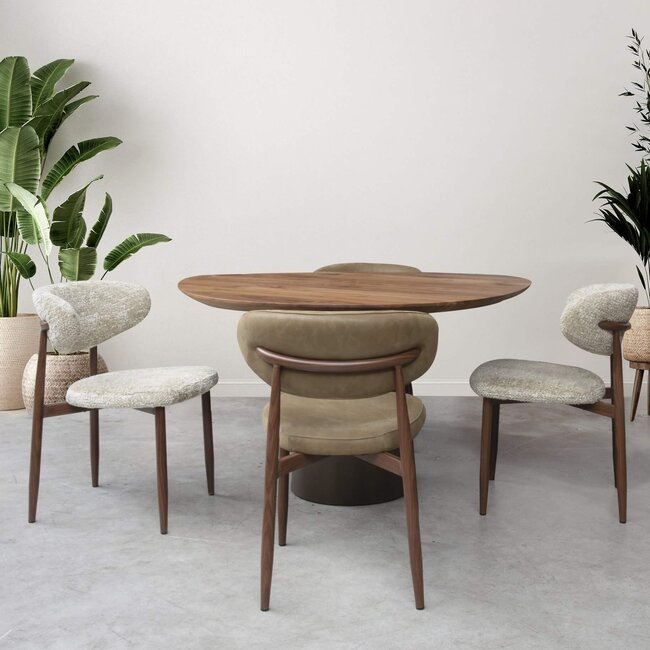 Het slanke metalen frame in walnut kleur geeft eetkamerstoel Gigi een warme en stijlvolle uitstraling. Dit frame vormt een mooi contrast met de zachte stoffering van de zitting en maakt de stoel eenvoudig te combineren met houten eettafels, moderne interieurs en natuurlijke materialen zoals steen en linnen.