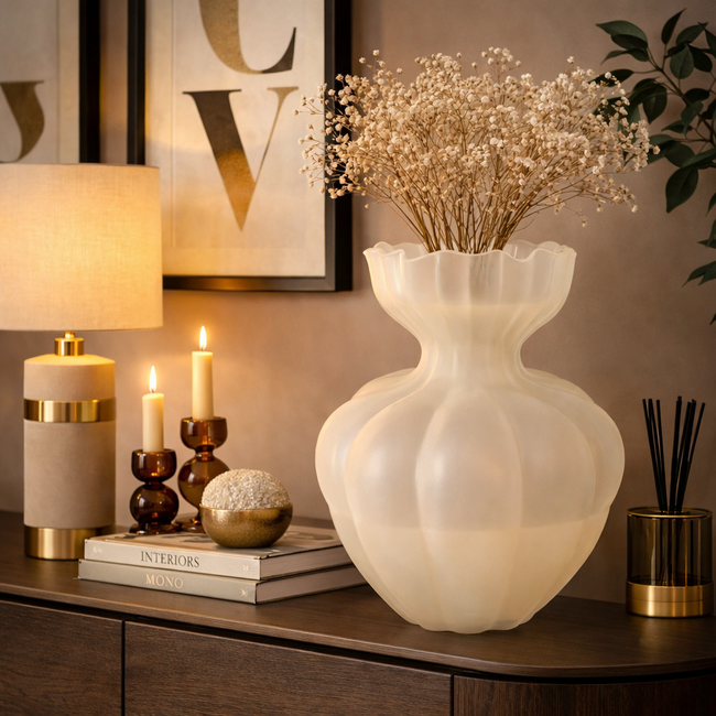 Vaas Lenore is een glazen vaas met een mat bruine kleur. De organische vormen van deze vaas en het fraaie grafische patroon maken dat deze vaas een echte eyecatcher is. Met deze vaas kun je alle kanten op. Kies jij voor een mooie kleurrijke bos of een paar rustig gekleurde kunstbloemen?