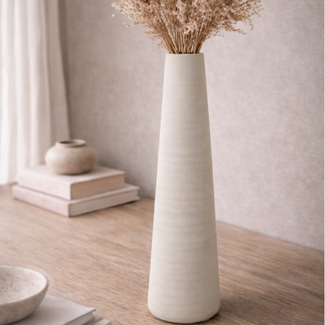 De Vaas Nohr XL is hét toonbeeld van eenvoud en elegantie. De hoge, slanke vorm in combinatie met een effen crème tint zorgt voor een moderne uitstraling die rust en stijl uitstraalt. Ideaal voor liefhebbers van minimalistisch of Scandinavisch design.