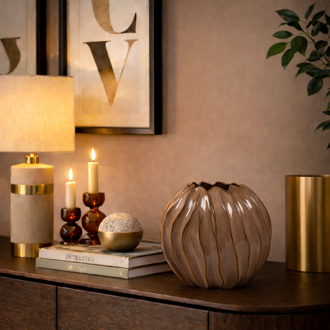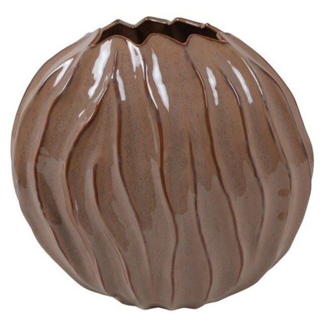 De Vaas ovaal Korali L bruin valt direct op door haar bijzondere ovale silhouet. De vloeiende, verticale reliëflijnen geven de vaas een speels en dynamisch karakter. Door de combinatie van hoogte (42 cm) en breedte (41 cm) heeft deze vaas een krachtig en sculpturaal effect.