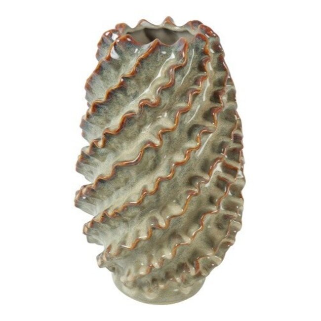 De Vaas Rufa M groen van Countryfield is een decoratieve vaas met een uitgesproken en natuurlijke uitstraling. De speelse vorm met golvende lijnen en reliëf geeft de vaas een uniek karakter en zorgt ervoor dat hij direct opvalt in je interieur.