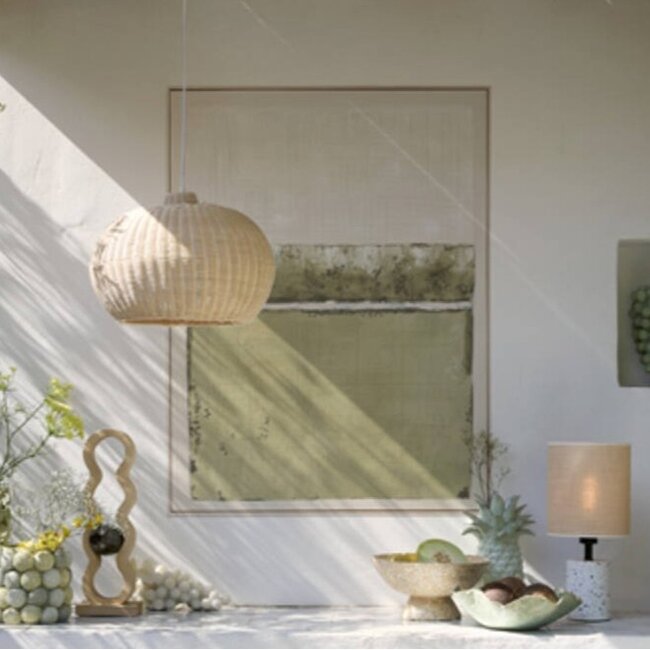 De abstracte vormen en natuurlijke tinten maken dit wandornament ideaal voor interieurs in Scandinavische, Japandi of minimalistische stijl. Het zachte kleurgebruik brengt balans en harmonie in de ruimte, terwijl de structuur en details zorgen voor een uniek visueel effect. De houten lijst in een naturel kleur geeft het geheel een warme en natuurlijke uitstraling.