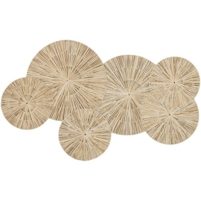 Het Wandpaneel Aruba van Must Living is een indrukwekkend en natuurlijk wandobject dat direct sfeer en warmte toevoegt aan je interieur. Dit grote wandpaneel is handgemaakt van palmblad en bestaat uit meerdere ronde vormen die samen een speels en organisch geheel vormen.