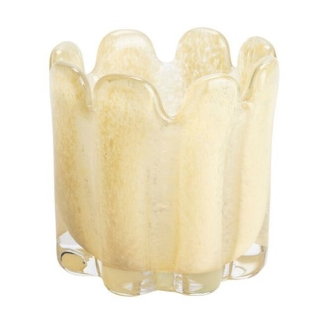De Waxinelichthouder Gramma 11x11 cm - beige van Isaa is een verfijnd woonaccessoire dat sfeer en zachtheid toevoegt aan je interieur. Het ontwerp valt op door de speelse, golvende rand en de subtiele beige kleurnuances in het glas. Hierdoor heeft deze waxinelichthouder een elegante en decoratieve uitstraling die zowel overdag als ’s avonds prachtig tot zijn recht komt.